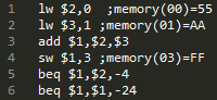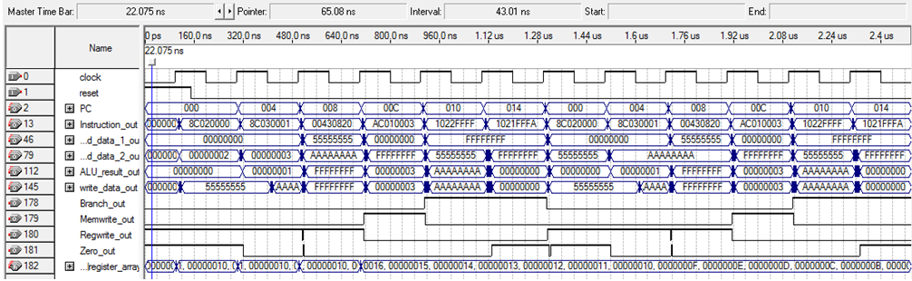 The PC keeps track of which instruction is executing. At location 000, it is executing the first lw. You can see this in the write_data_out line, since it shows the address that it is fetching. It’s storing in register 2, which can be seen in the read_data_2_out line. Similarly, the next instruction at 004 (4 bytes, or 1 word in front of the last instruction), stores the word in register 3 (seen in read_data_2_out) and is fetching from AA. The data in those 2 locations is 0 and 1, respectively. The ALU shows that. The add instruction at 008 does 0-1, which is -1, or FFFFFFFF, as seen in ALU out. Next, we store that result in memory during instruction 00C (read_data_2_out shows FFFFFFF moving). At 010, $1 and $2 are compared and found to be not equal, so we go to 014 where we find that $1 and $1 are equal. Then the PC goes back to the beginning of the instructions, the first lw instruction. From there, the whole process repeats itself.