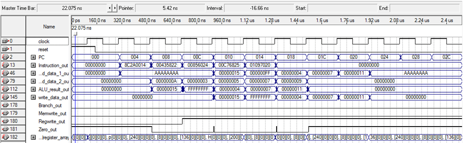 Here, you can see that starting at the second clock, the PC is incremented by 4 each time. This is also reflected below by instruction_out. You can see that each clock brings in another instruction and fills the pipeline. Read data 1 and 2 both show the output from the decode stage. ALU result shows what is coming off of the ALU and into the memory stage. Write data out can be seen waiting for an instruction that requires a write to a register before going high. Branch and memwrite are both always low because there are no branches or store words in the given instructions. Regwrite goes high one clock before write data does. You can also see where the registers are written after each instruction that writes to them.
